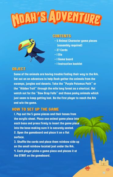 We're excited to announce the release of Noah's Adventure from ollyoop.fun. The game is in limited production and distribution now. However, you can help us make it the next great children's board game. Contact us to learn more.